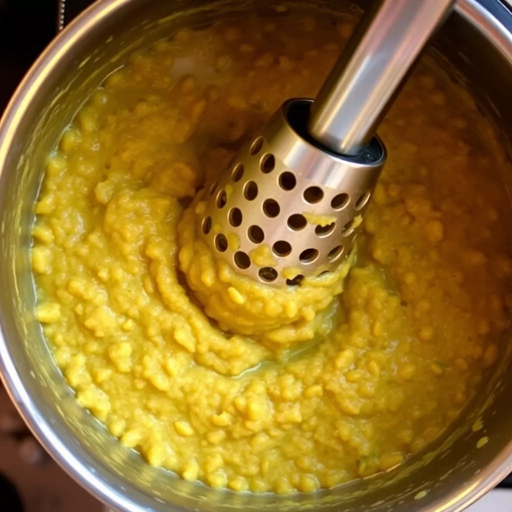 3. Gently mash: After the dal is soft, lightly mash it for about 30 seconds — keep some texture and avoid turning it into a smooth paste.