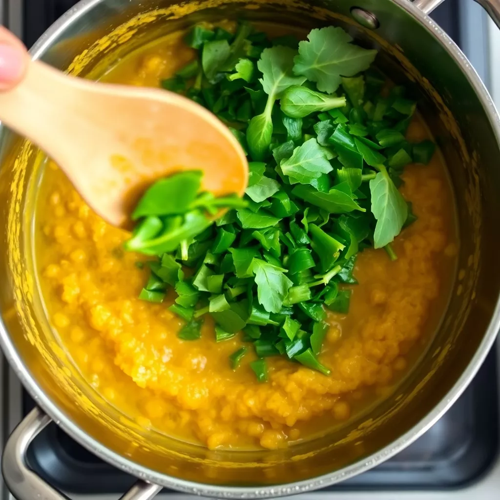 4. Add spinach: Stir in the chopped spinach and let the soup simmer for 4–5 minutes until the spinach wilts and blends with the dal.